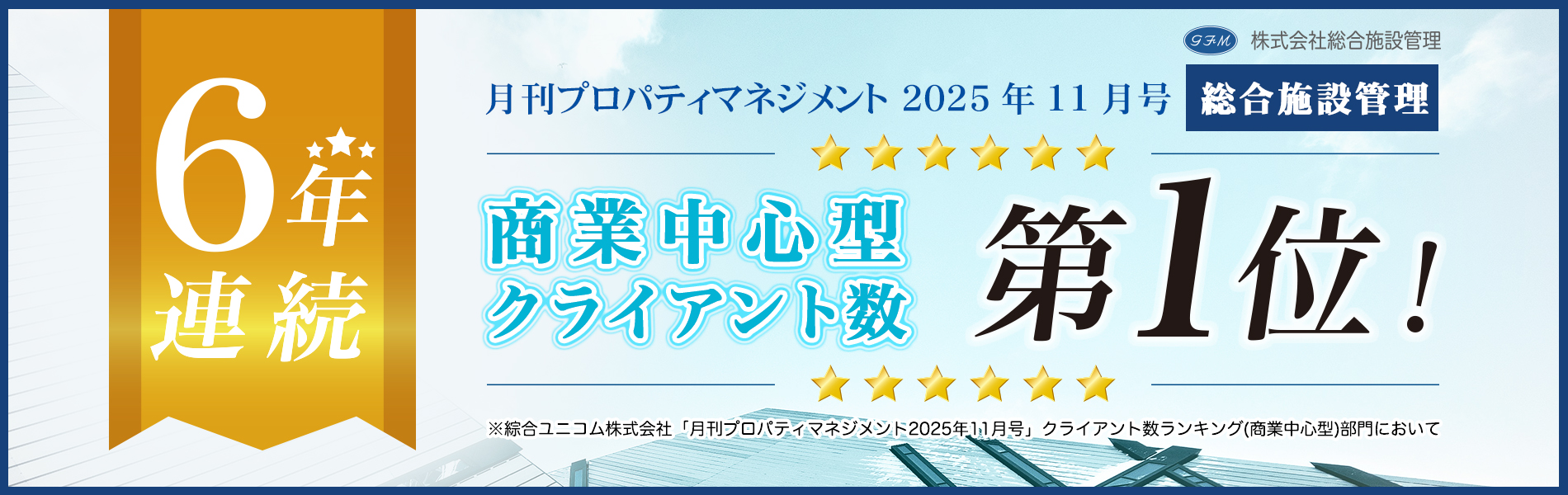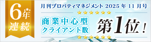 2025年11月12日 / 最終更新日時 : 2025年11月12日 スタッフ ニュース 6年連続 商業中心型クライアント数「第1位」を獲得致しました 綜合ユニコム株式会社より発行されております「月刊プロパティマネジメント2025年11月号」にて調査された「商業中心型クライアント数」において、総合施設管理が6年連続「第1位」を獲得致しました。