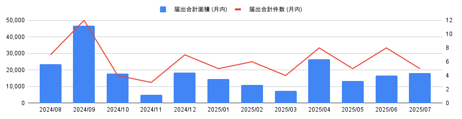 届出合計面積 (月内) | 18,148 | 16,692 | 13,405 | 26,600 | 7,283 | 11,113 | 14,519 | 18,401 | 4,901 | 17,795 | 46,636 | 23,507 | |