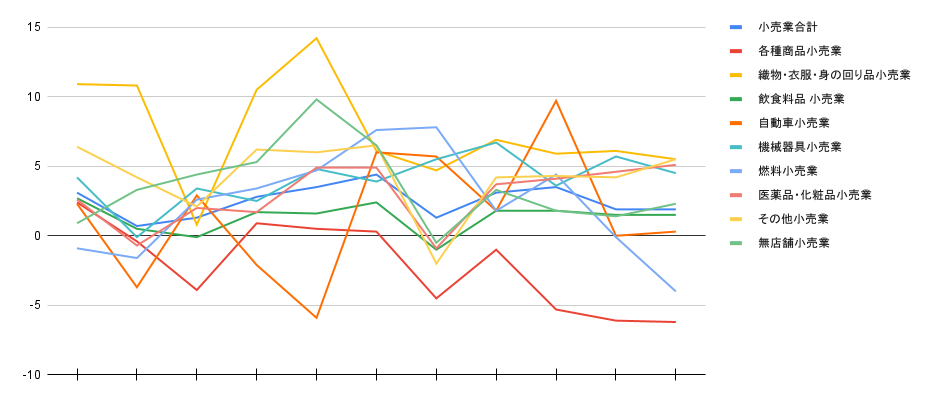 燃料小売業 | -4.0 | -0.1 | 4.4 | 1.8 | 7.8 | 7.6 | 4.7 | 3.4 | 2.6 | -1.6 | -0.9 | |