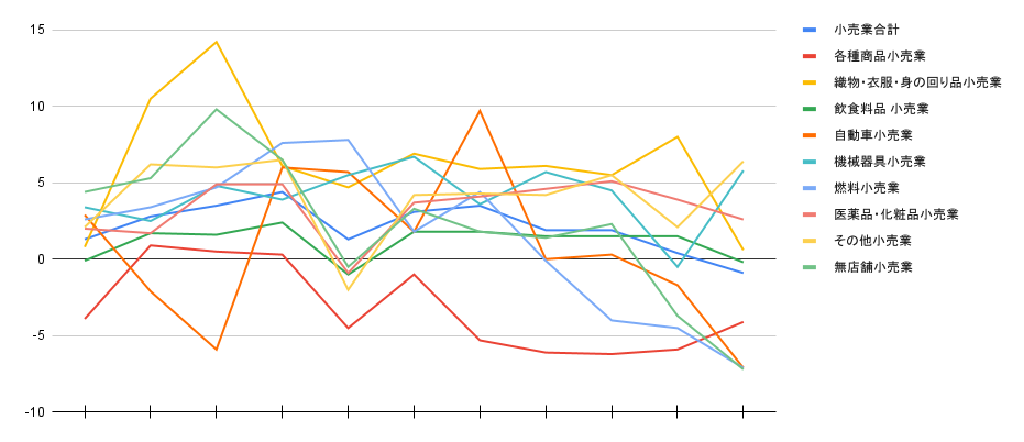 | 燃料小売業 | -7.1 | -4.5 | -4.0 | -0.1 | 4.4 | 1.8 | 7.8 | 7.6 | 4.7 | 3.4 | 2.6 | |