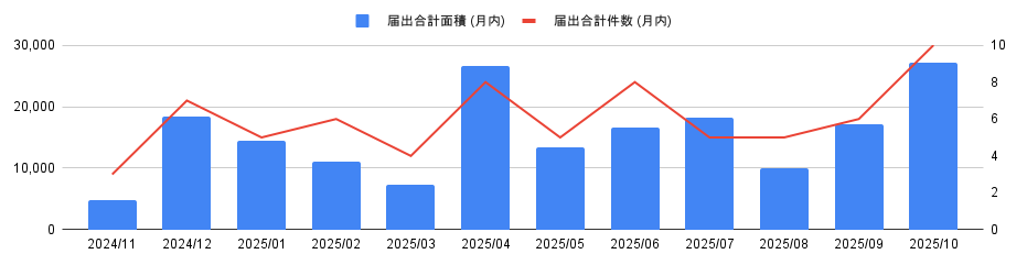 | 届出合計面積 (月内) | 27,112 | 17,064 | 9,985 | 18,148 | 16,692 | 13,405 | 26,600 | 7,283 | 11,113 | 14,519 | 18,401 | 4,901 | |