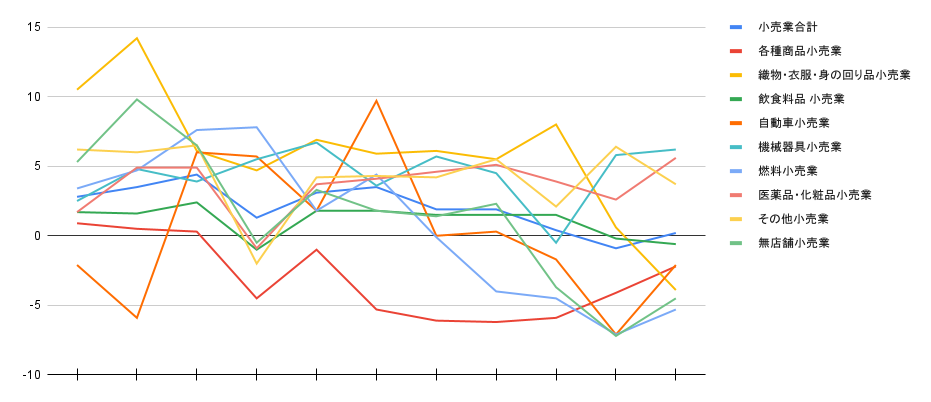 | 燃料小売業 | -5.3 | -7.1 | -4.5 | -4.0 | -0.1 | 4.4 | 1.8 | 7.8 | 7.6 | 4.7 | 3.4 | |