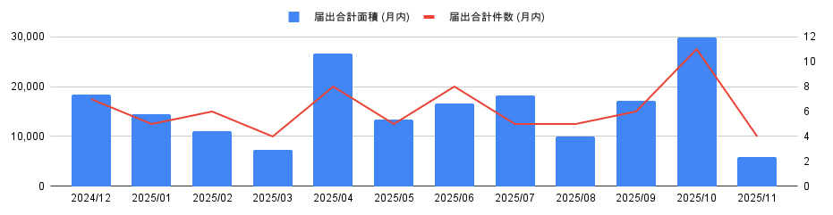 | 届出合計面積 (月内) | 5,856 | 29,812 | 17,064 | 9,985 | 18,148 | 16,692 | 13,405 | 26,600 | 7,283 | 11,113 | 14,519 | 18,401 | |