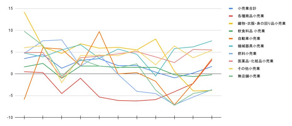 | 燃料小売業 | -3.6 | -5.3 | -7.1 | -4.5 | -4.0 | -0.1 | 4.4 | 1.8 | 7.8 | 7.6 | 4.7 | |