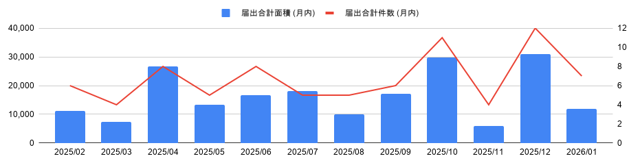 | 届出合計面積 (月内) | 11,850 | 31,004 | 5,856 | 29,812 | 17,064 | 9,985 | 18,148 | 16,692 | 13,405 | 26,600 | 7,283 | 11,113 | |