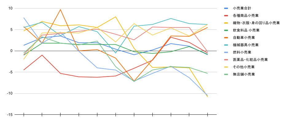 | 織物・衣服・身の回り品小売業 | -10.8 | -4.0 | -3.8 | -3.9 | 0.6 | 8.0 | 5.5 | 6.1 | 5.9 | 6.9 | 4.7 | |